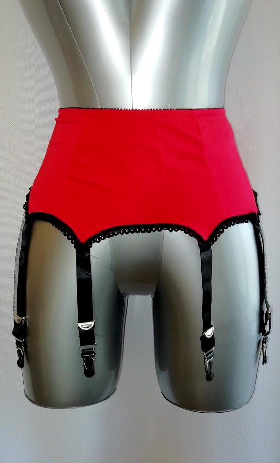 Пояс для чулок в ретро-стиле ярко красного цвета с черной окантовкой. В данной модели использованы пажи-"крокодильчики", способные удерживать даже плотные чулки. Сзади бельевая застежка.