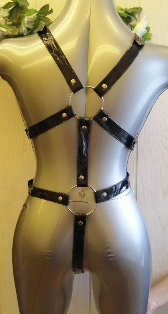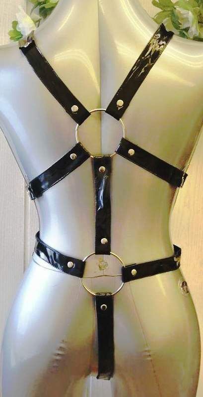 Откровенное мужское виниловое боди из черных ремешков, соединяющихся между собой металлическими кольцами. Длина варьируется от 68 до 85 см. Обхват груди в диапазоне 84-112 см, обхват талии в диапазоне 78-88 см. Выпускается в одном размере S-ХL.