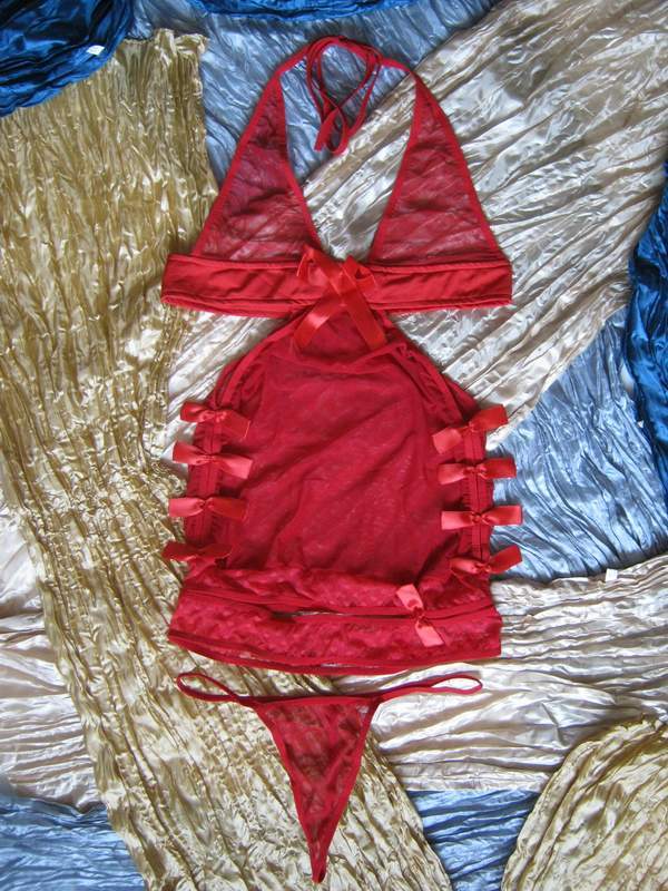 Эротическая ночная сорочка из сетчатого материала. Украшена бантиками по бокам. Чулки и подвязки для чулок в комплект не входят.