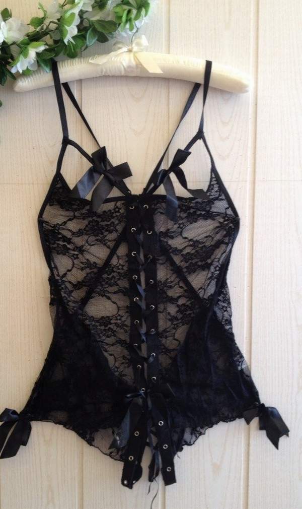 Эффектное боди выполнено из мягкого кружевного материала. Боди декорировано атласными бантиками и шнуровкой.