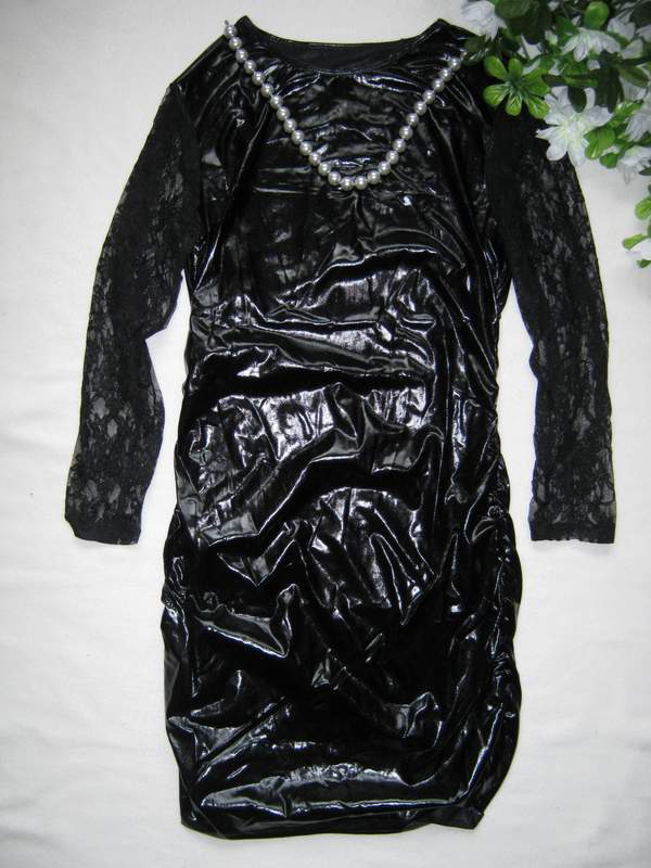 Виниловое платье с кружевным рукавчиком, сбоку сборка.