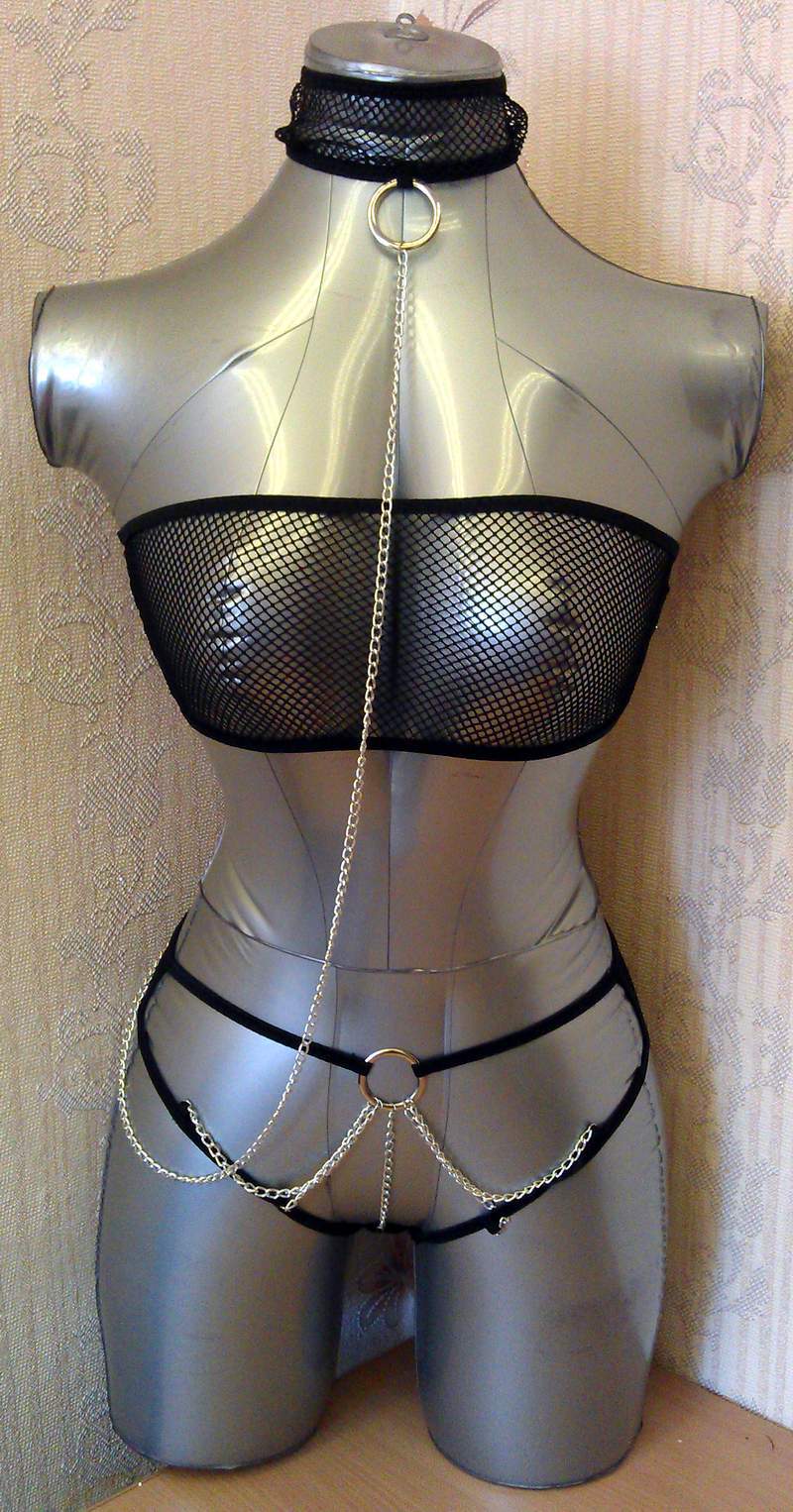 Сексуальный комплект в мелкую сетку, декорирован цепями.