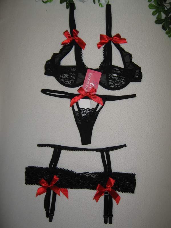 Эротический кружевной комплект украшен яркими атласными бантиками. Лиф соблазнительно открывет грудь.