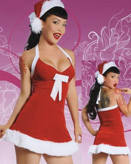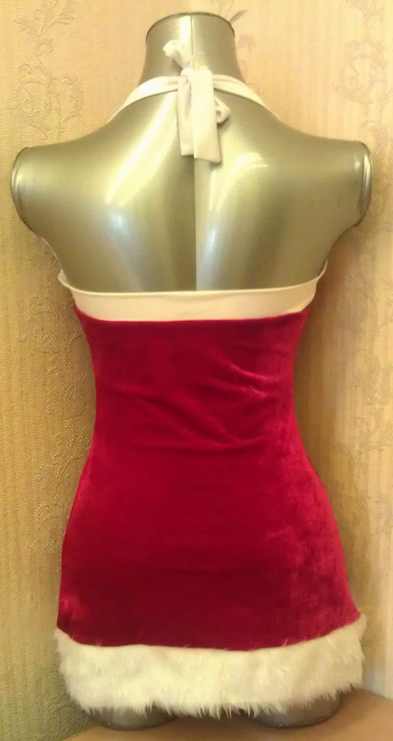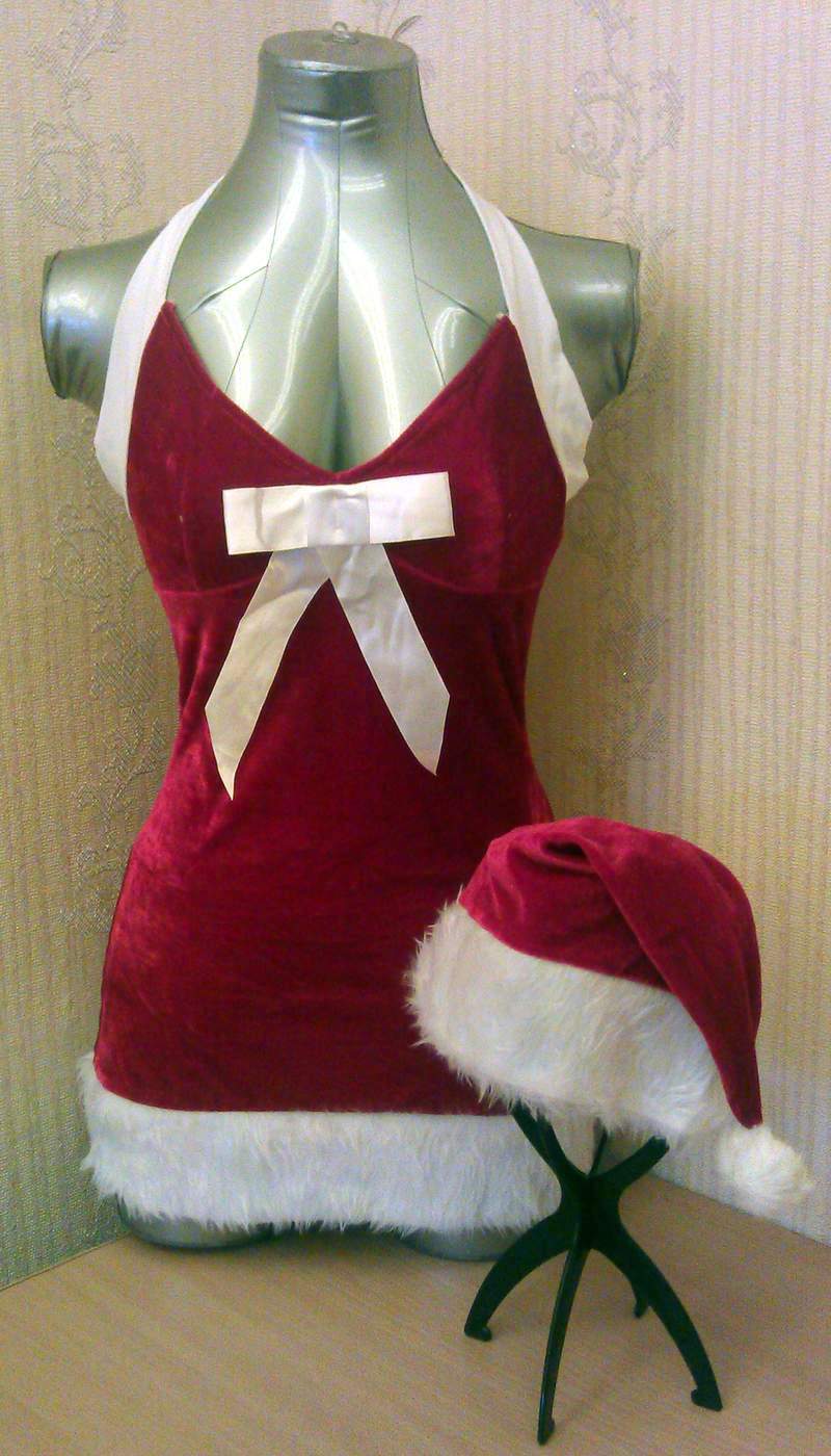 Новогоднее бархатное платье в комплекте с колпаком удачно подойдут на новогоднюю ночь. Платье завязывается на шее, по низу украшено мехом.