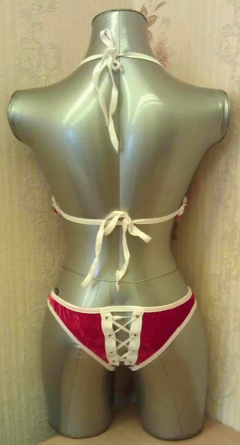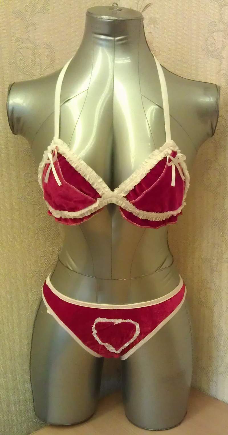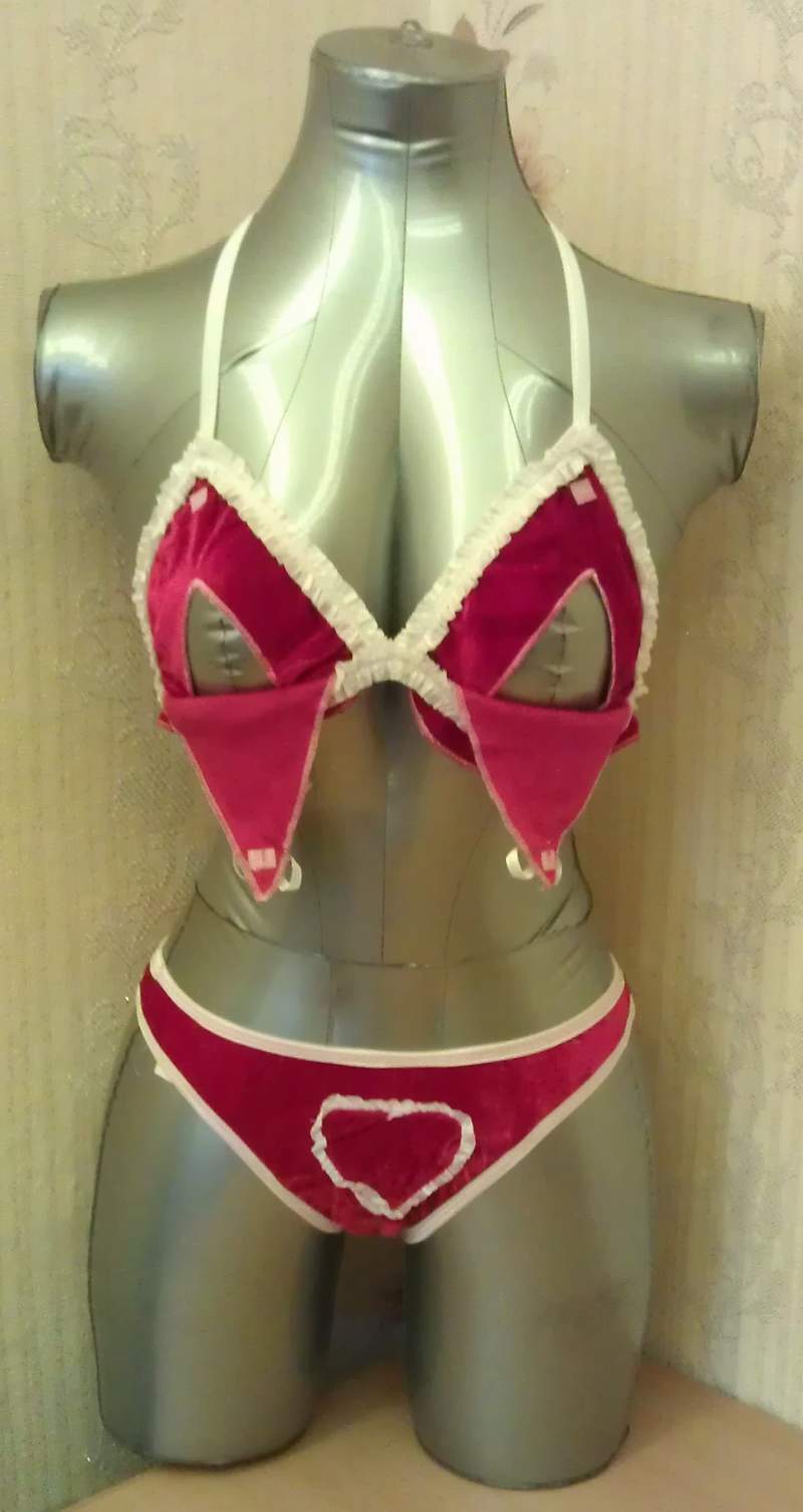 Сексуальный комплект из бархатного материала. Трусики с разрезом в интимной части и шнуровкой на попе, топ с открывающимися занавесочками на груди.