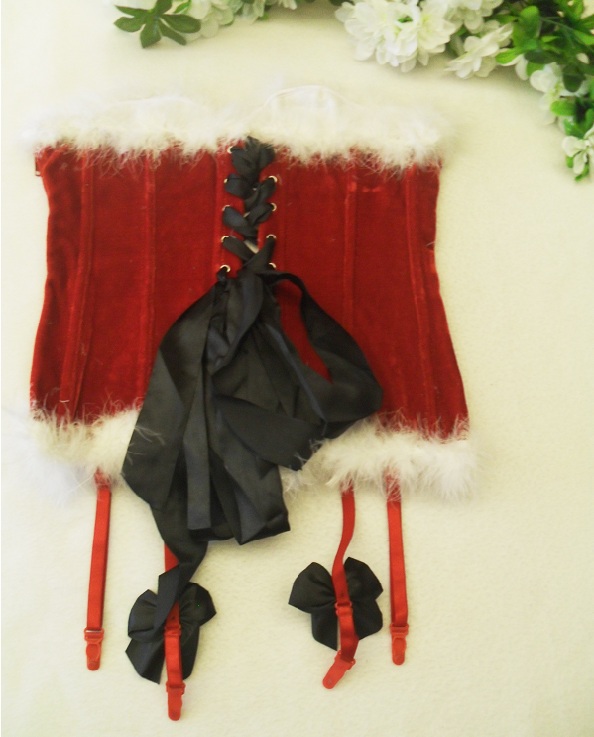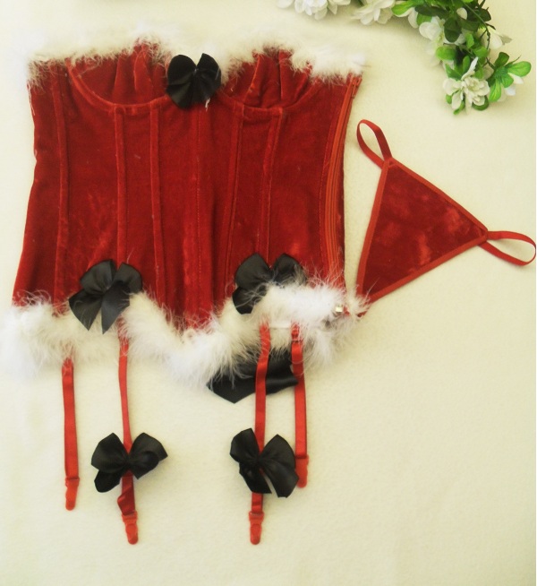 Сексуальный новогодний корсет с подвязками для чулок, украшенный атласными бантиками и пухом марабу. В комплект входят трусики-стринги.