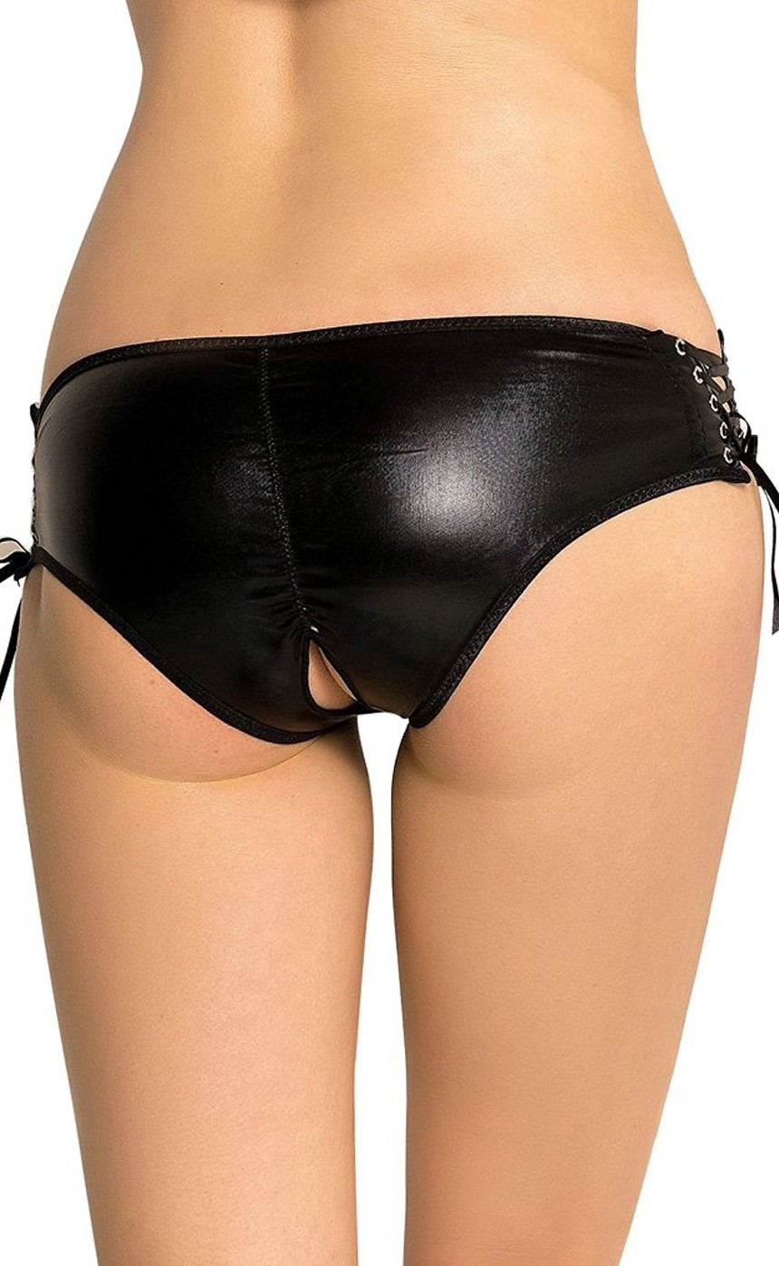 Соблазнительные трусики выполнены из трикотажа с ПВХ-напылением. Шнуровка по бокам позволяет корректировать посадку по фигуре. Вырез в интимной зоне позволяет не снимать трусики во время эротических игр.