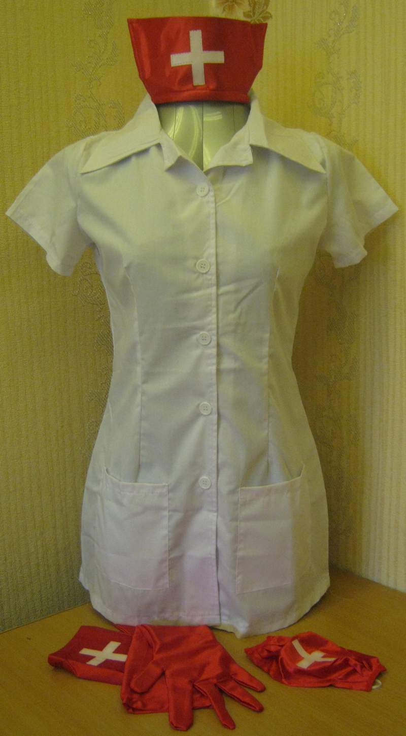 Костюм медсестры включает коротенькое обтягивающее платье на пуговицах, красный перчатки, подвязки для чулок, маска и убор на голову.