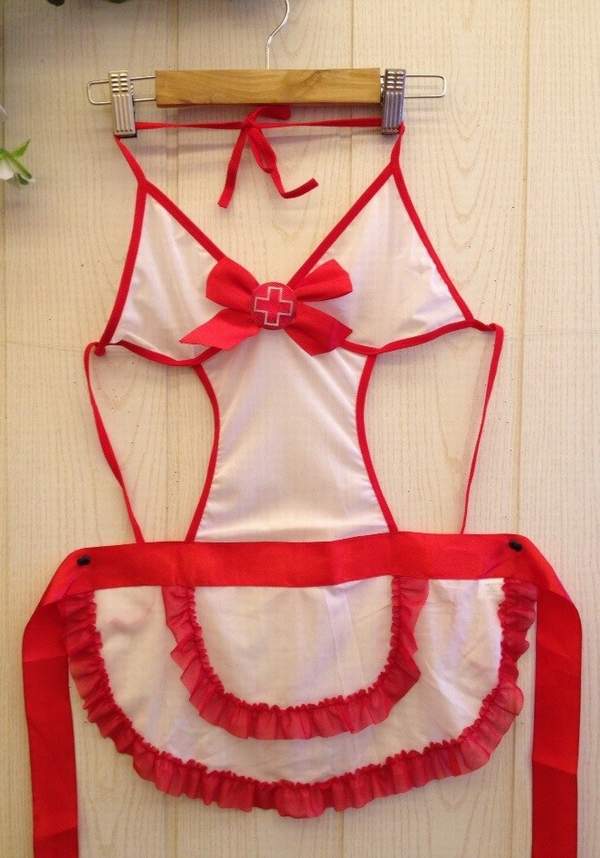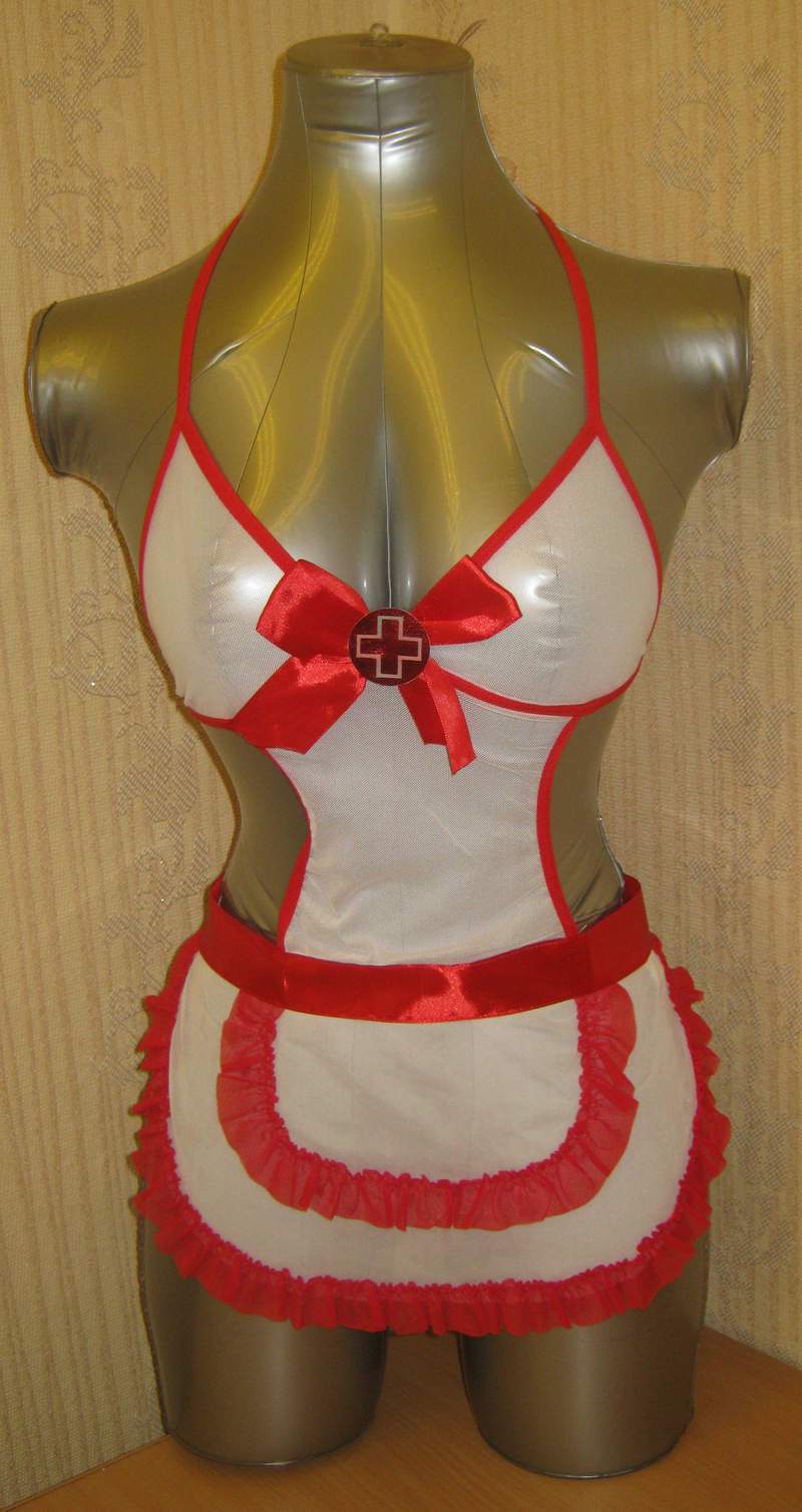 Соблазнительный фартучек с ярко-красной отделкой и значком скорой помощи. В комплекте трусики и шапочка.