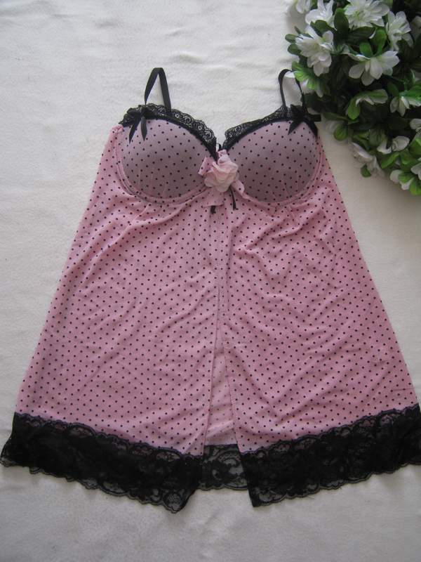 Сорочка на тонких бретельках нежно-розового цвета в мелкий черный горошек, лиф поролоновый на косточках.