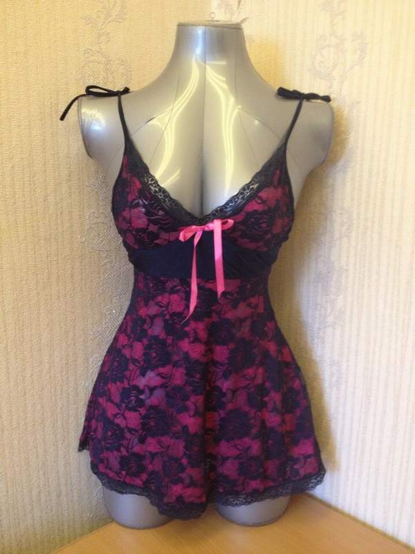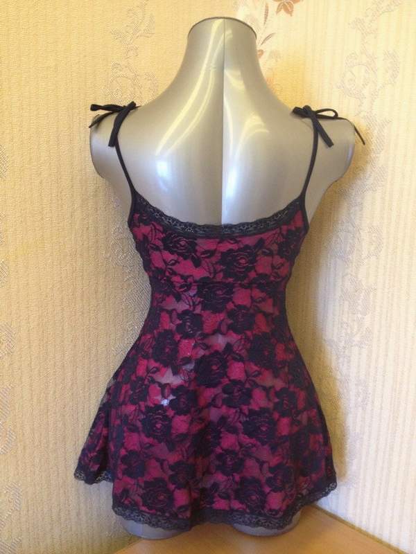 Очаровательная двухслойная сорочка из розового и фиолетового мягкого кружева. Лиф и подол украшены тесьмой.