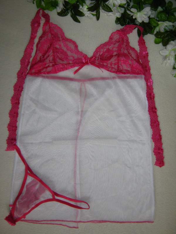 Женственная полупрозрачная сорочка в комплекте с трусиками выполнена из мягкого сетчатого материала. Лиф выполнен из яркого кружева. Сорочка завязывается на шее и имеет разрез сзади.