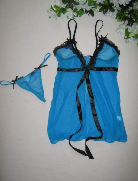 Сорочка с разрезом от груди и ажурной лентой. В комплект входят трусики-стринги.