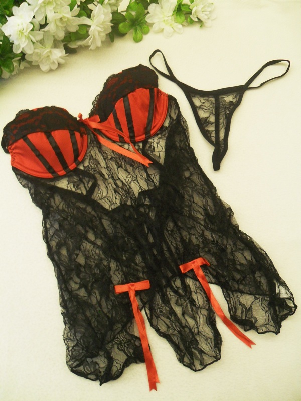 Сетчатая сорочка с переплетением на спине и ажурными ленточками. В комплект входят трусики-стринги.