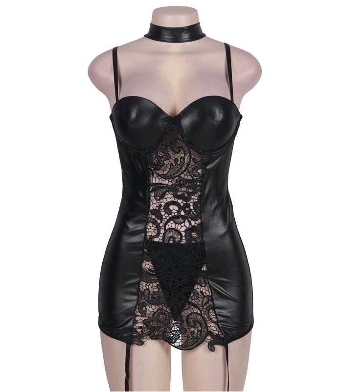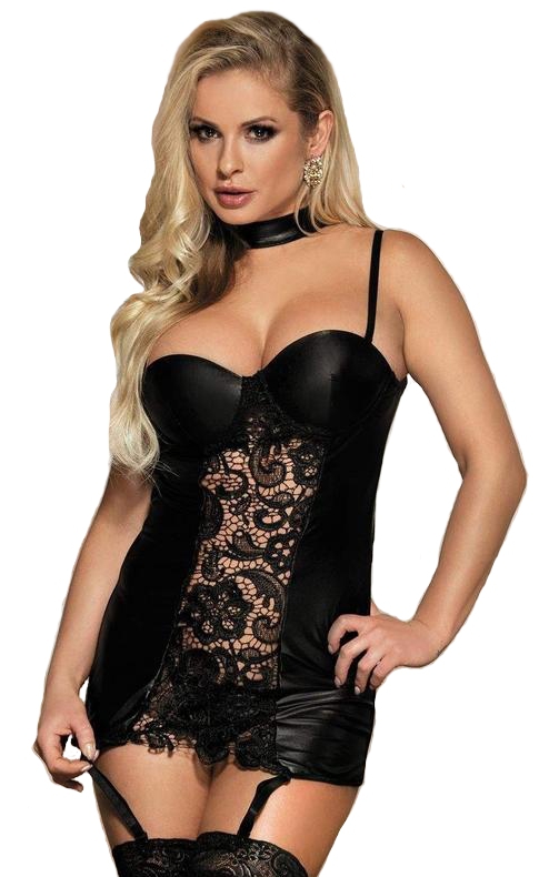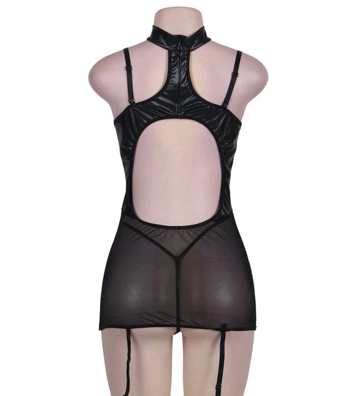 Сорочка выполнена из ткани, имитирующей винил. Украшена вставкой из мягкого кружева. Спинка сорочки выполнена из микроcетки. Имеет несъемные регулируемые по длине пажи для чулок. Трусики-стринги из аналогичной ткани дополняют комплект. Выпускается в размерах S-M, L-XL, 2XL-3XL, 4XL-5XL.