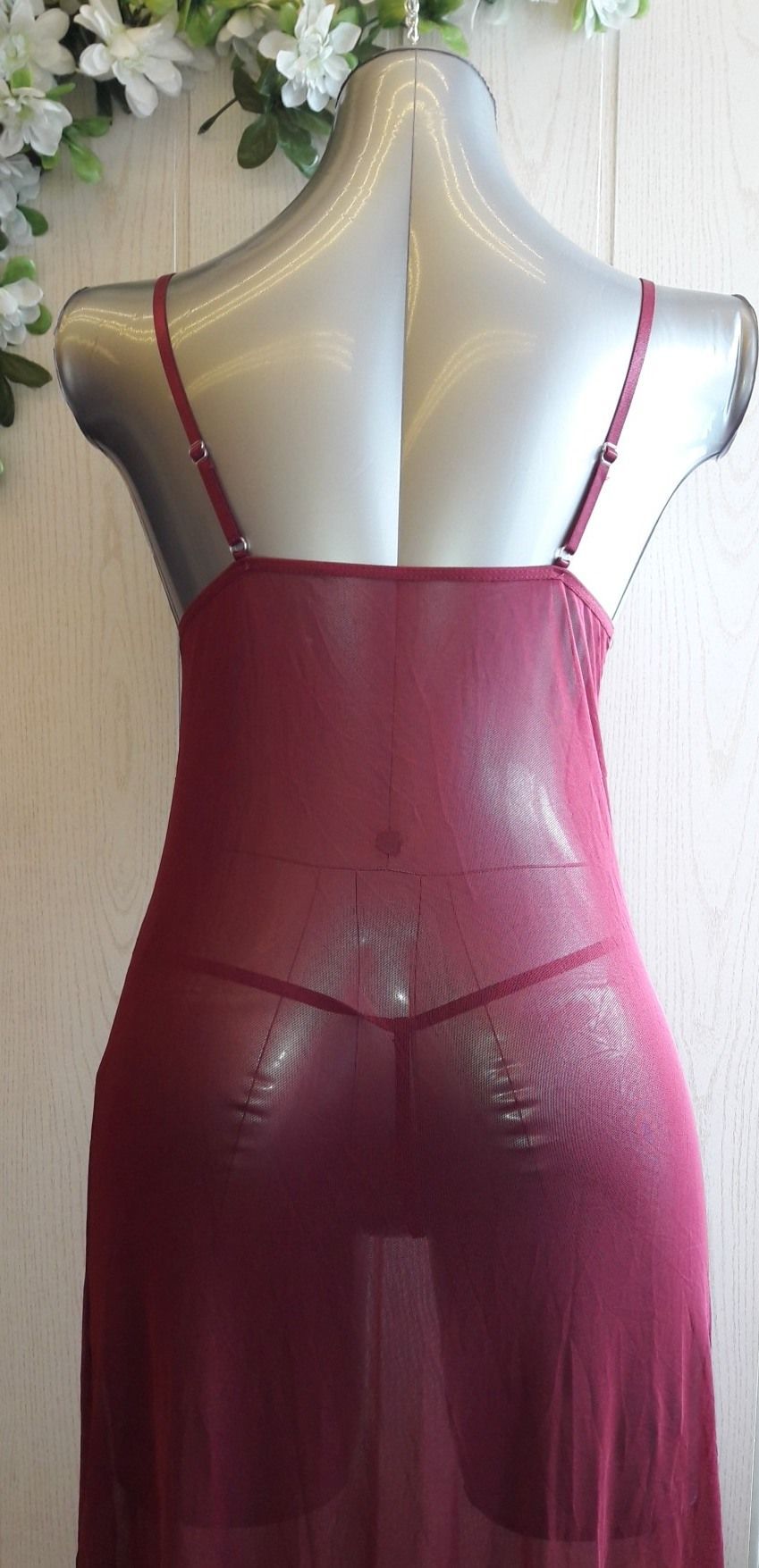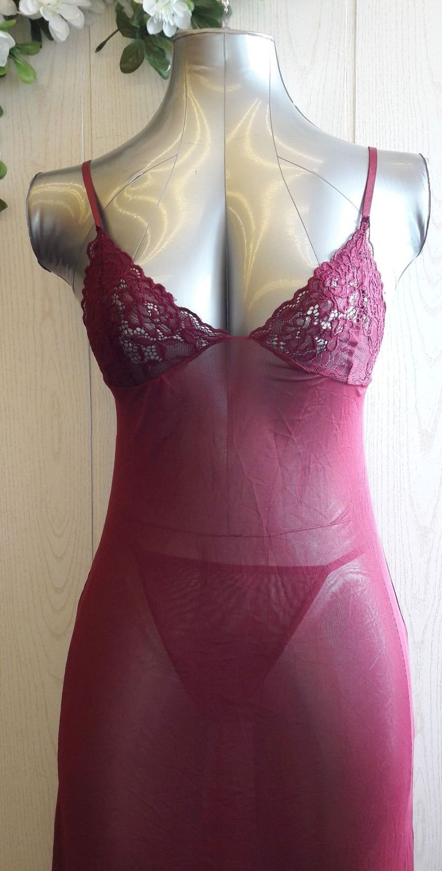 Длинная вишневая сорочка пошита из полупрозрачной микросетки, лиф выполнен из плотного кружева. Длина сорочки без учета регулируемых бретелей 120 см. Модель выпускается в одном размере S-M