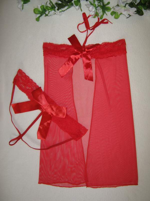 Эротический комплект из топа и трусиков выполнен из полупрозрачного материала. Сорочка с разрезом завязывается на шее.