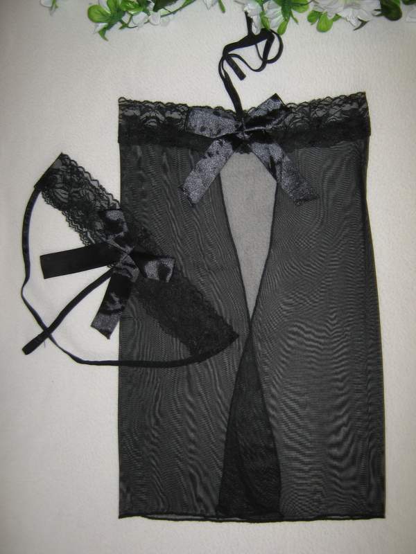 Эротический комплект из топа и трусиков выполнен из полупрозрачного материала. Сорочка с разрезом завязывается на шее.