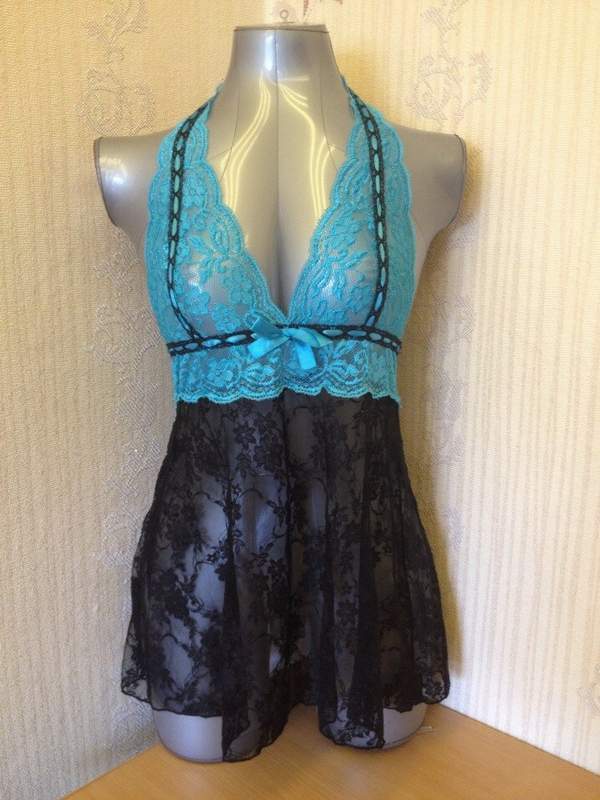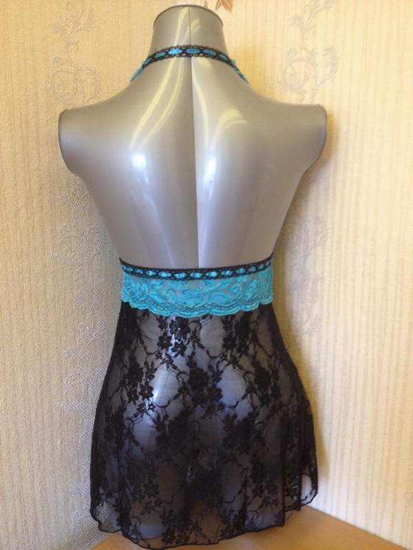Короткая кружевная сорочка с мягким кружевным лифом лазурног цвета. Спинка открыта.