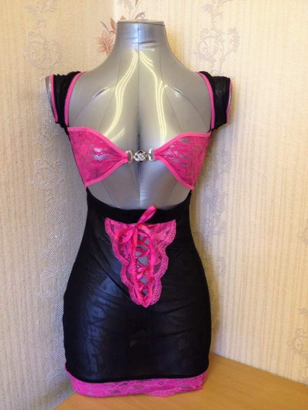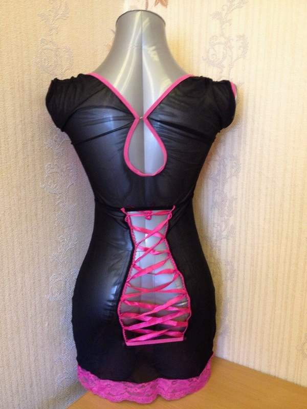 Сорочка выполнена в черно-розовой цветовой гамме. Облегающий фасон сорочки подчеркивает все изгибы тела. Декором являются атласные ленты и кружево.
