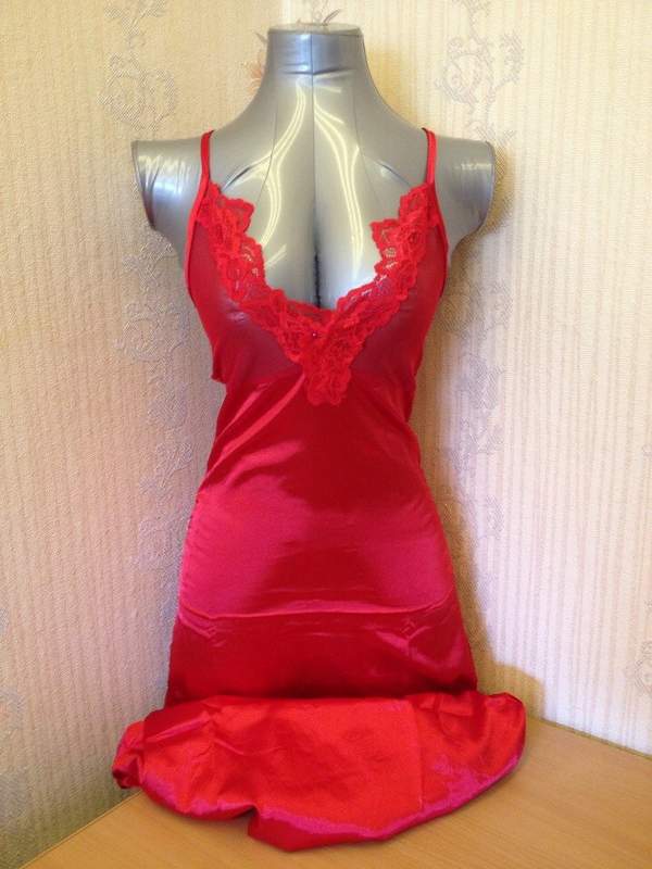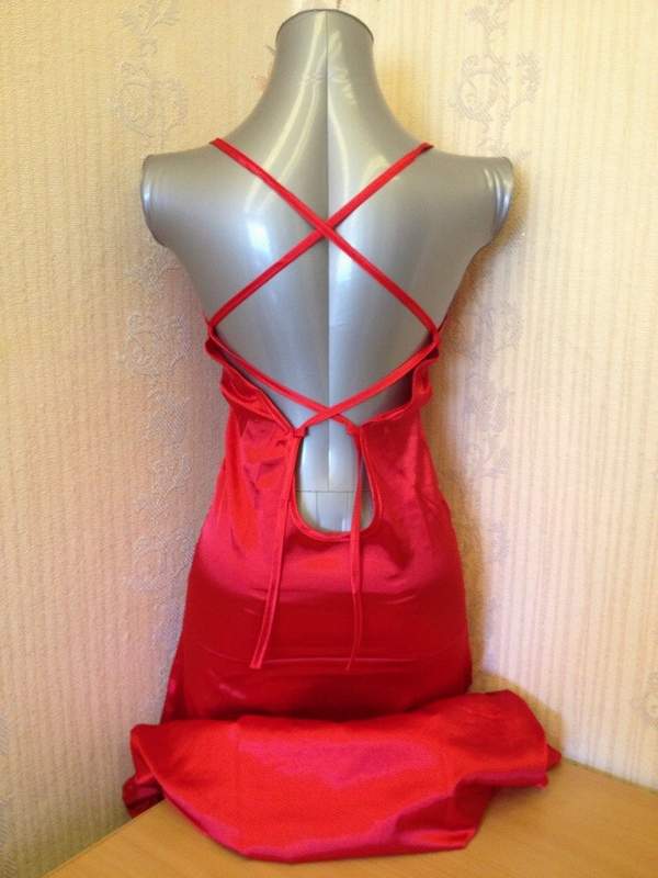 Длинная ночная сорочка из красного атласного материала. Бретели перекрещиваются на спинке, по низу подола - оборки.