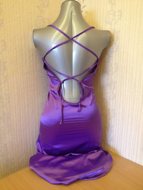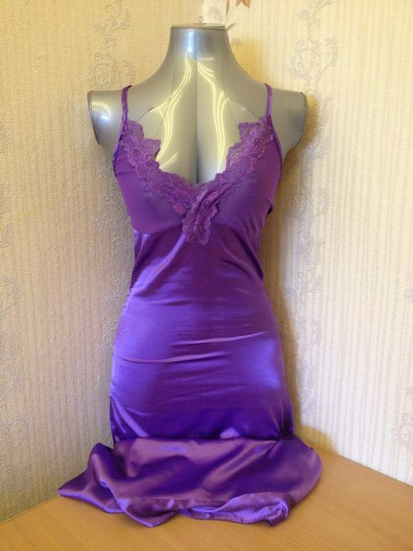 Длинная ночная сорочка из фиолетового атласного материала. Бретели перекрещиваются на спинке, по низу подола - оборки.