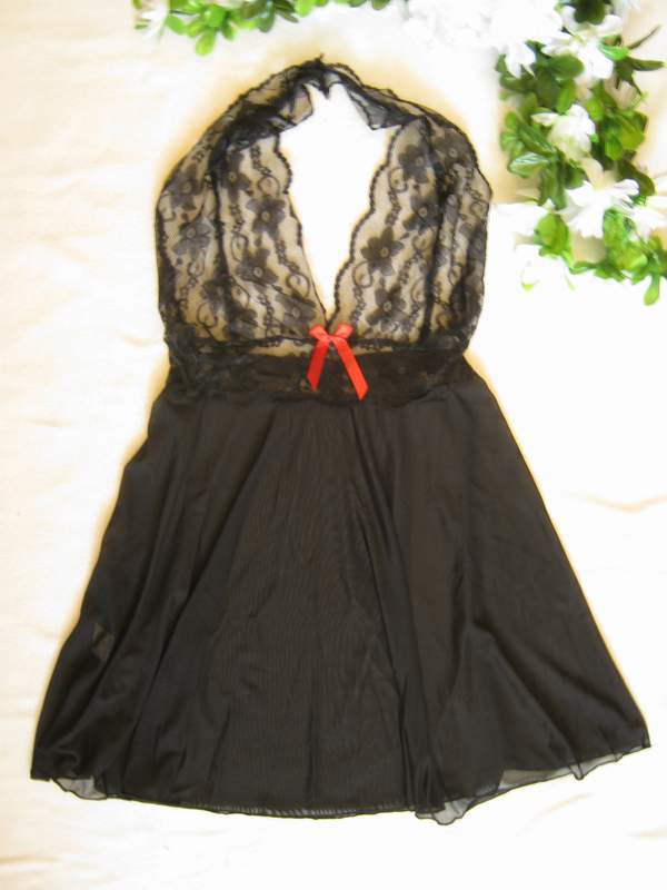 Полупрозрачная черная сорочка с мягким кружевным лифом украшена маленьким красным бантиком.
