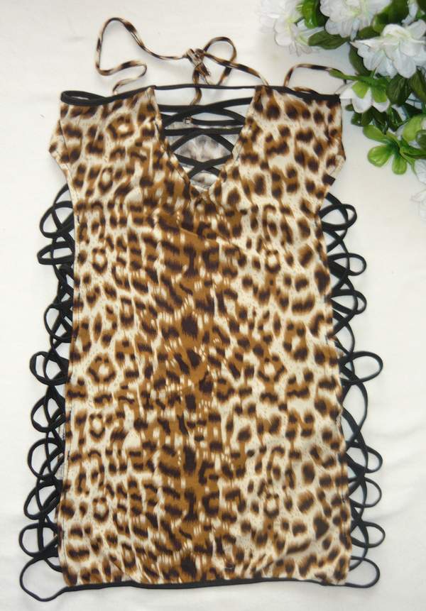 Платье трендовой леопардовой расцветки с соблазнительными боковыми разрезами, украшенными эластичной лентой контрастного черного цвета. В комплект входят труски-стринги лепардовой расцветки.