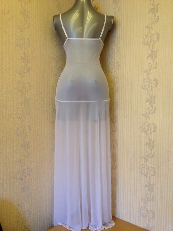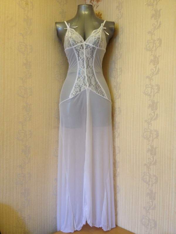 Длинная ночная сорочка с высоким разрезом. Украшают сорочку кружевной лиф и кружевная вставка спереди. Лямки регулируются по высоте.