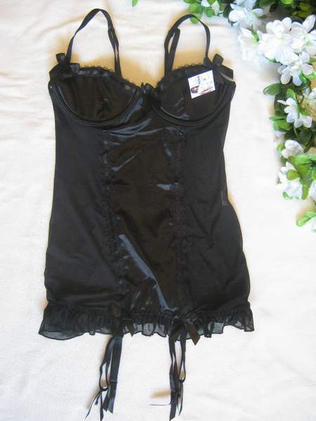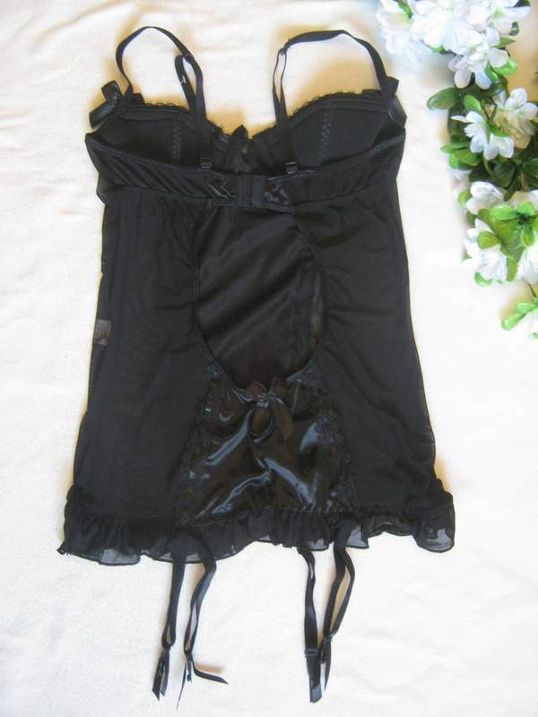 Черная сорочка выполнена из эластичного сетчатого материала. Передняя часть и лиф сорочки сделаны из атласа. Сексуальный вырез на спинке делает образ женственным и кокетливым.