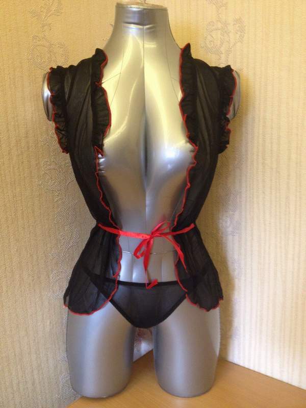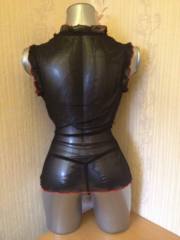 Полупрозрачная сорочка-халатик из нежной микросетки, укарашенная контрастной красной отделкой края и узкой атласной лентой-пояском.