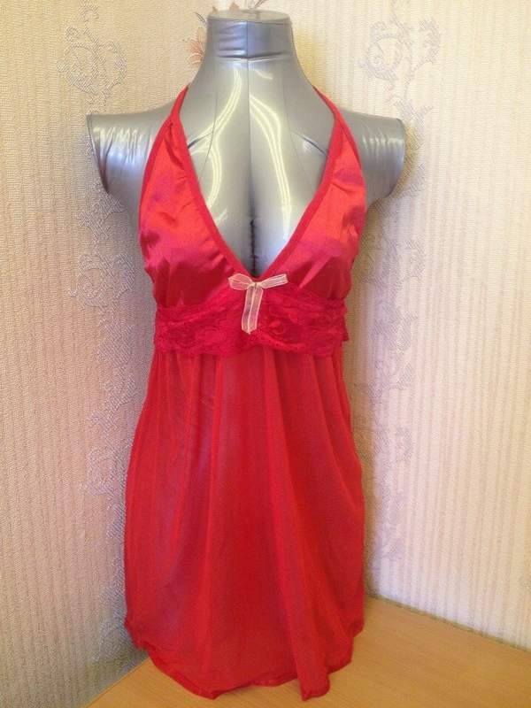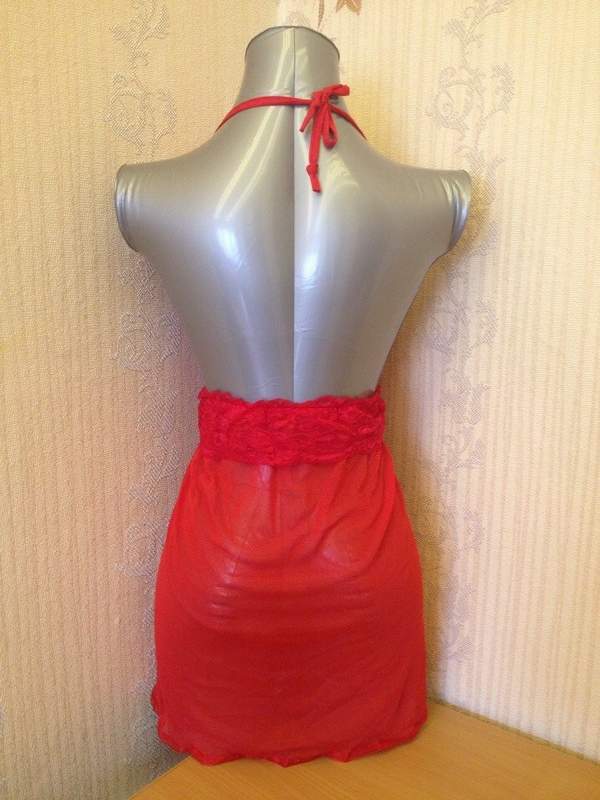 Ярко-красная сорочка свободного покроя выполнена из полупрозрачного сетчатого материала. Атласный лиф завязывается на шее, оставляя спинку полуоткрытой.