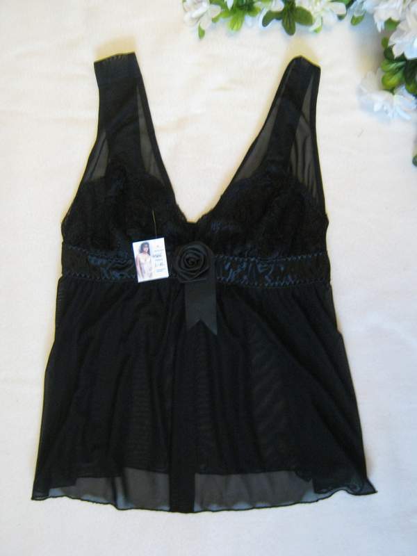 Черная полупрозрачная сорочка свободного покроя. Кружевной лиф украшен атласной розой в цвет сорочки.