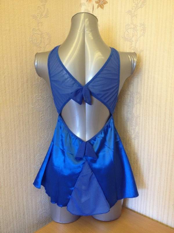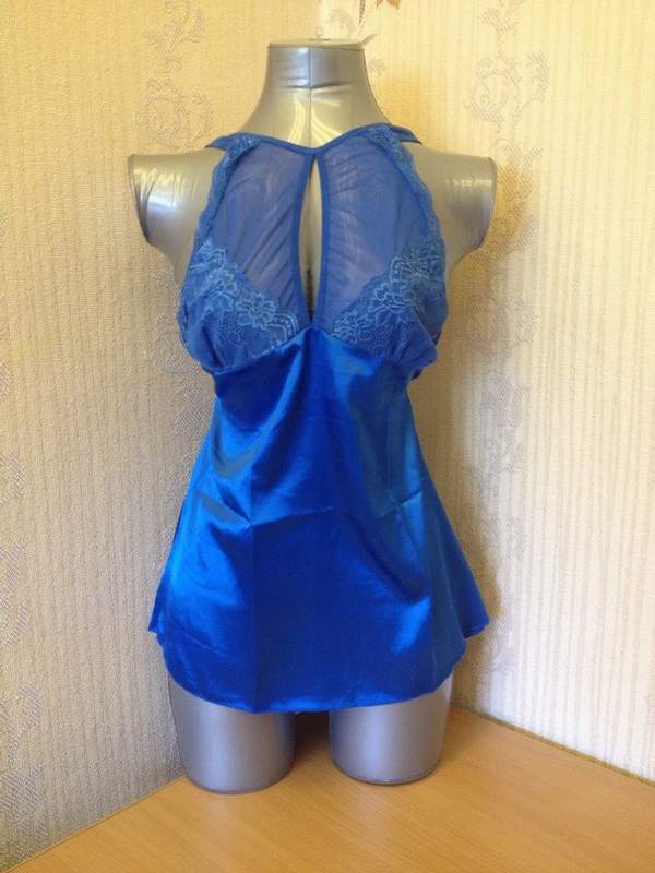 Короткая атласная сорочка с кружевным лифом и горловиной. В комплекте с трусиками.