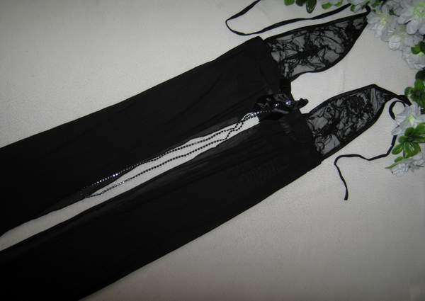 Длинная сорочка с разрезом от груди. В комплект входят трусики-пояс и подвязки