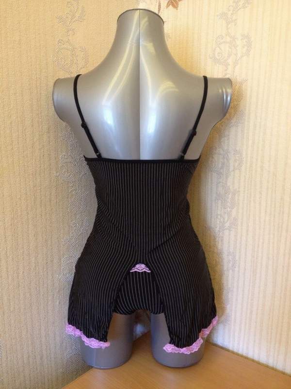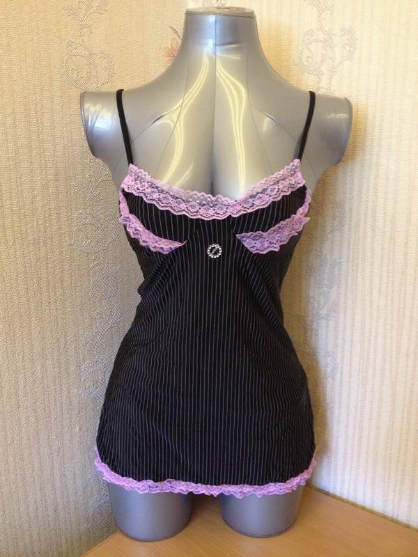 Элегантная ночная сорочка пошита из мягкого, приятного на ощупь материала. Вертикальные полосы вытяшивают силуэт. Лиф и подол декорированы розовым кружевом.