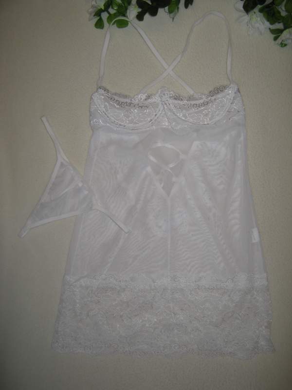 Полупрозрачная сорочка на тонких бретелях. Украшена кружевом, на спине шнуровка.