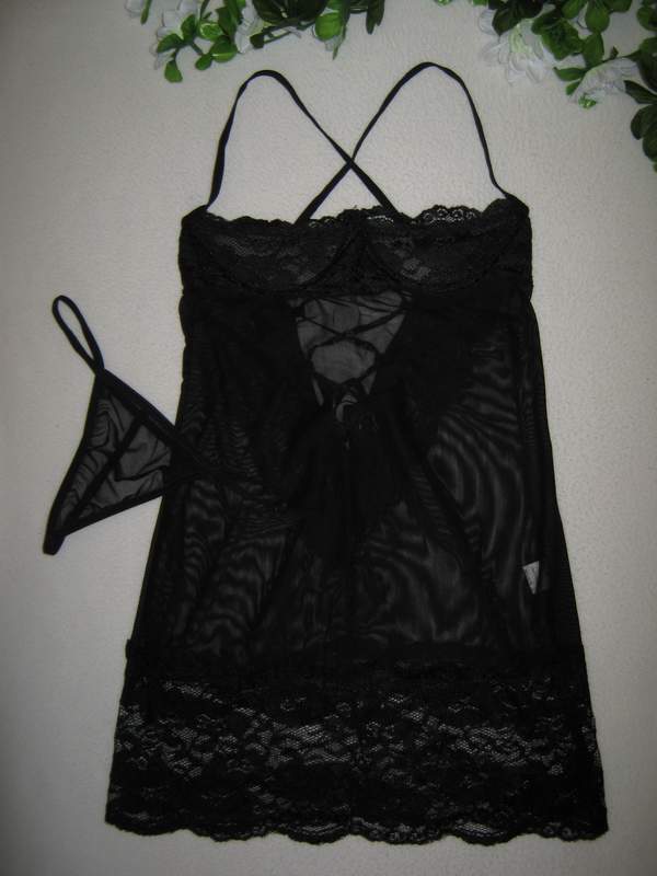 Полупрозрачная сорочка на тонких бретелях. Украшена кружевом, на спине шнуровка.