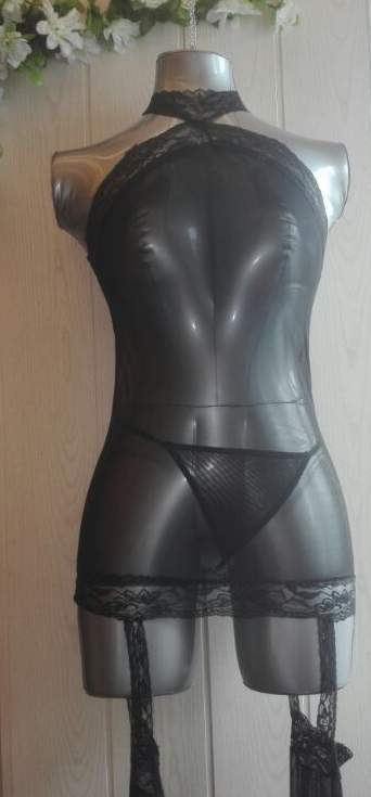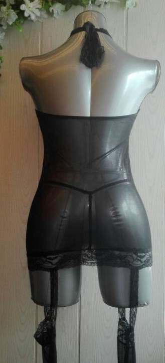 Замечательный комплект выполнен их мягкой ткани в мелкую сеточку и украшен кружевом. Чулки не отстегиваются.