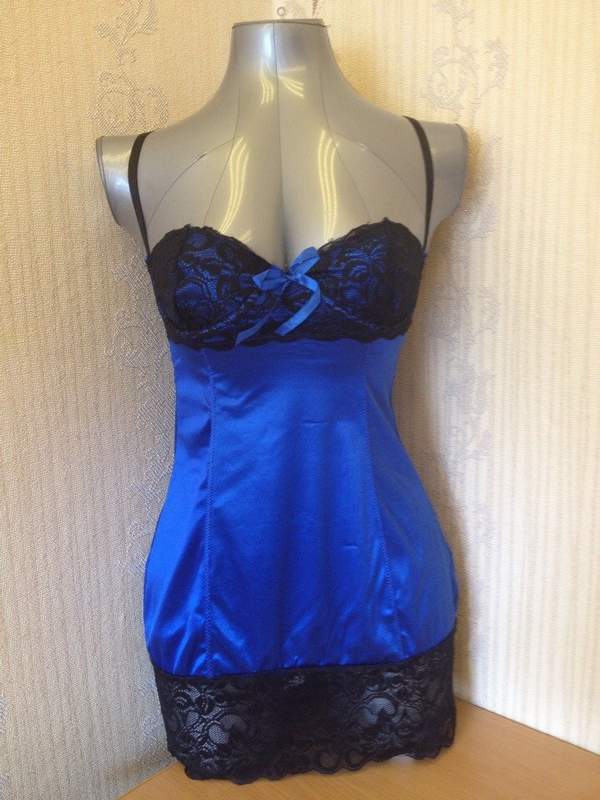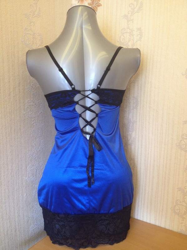 Сорочка идет в комплекте с трусиками и съемными подвязками для чулок. Контрастное кружево на лифе и подоле удачно дополняет сорочку.