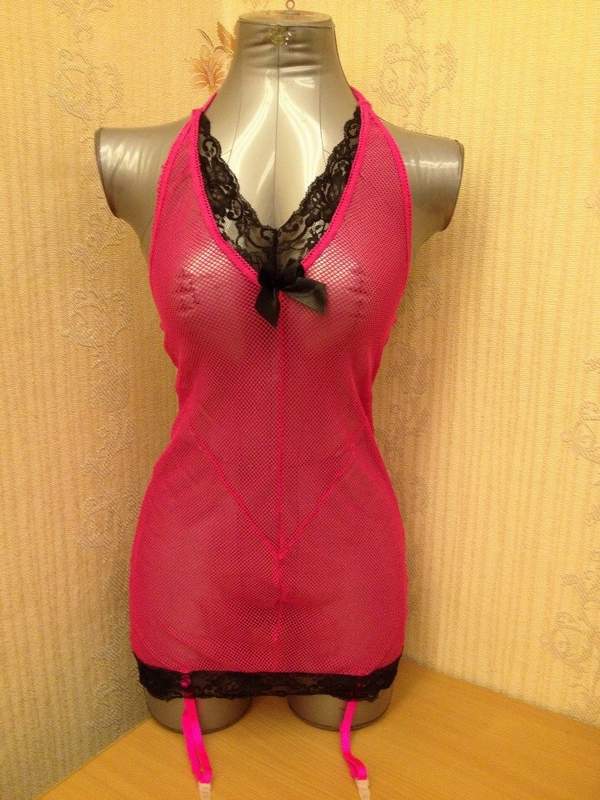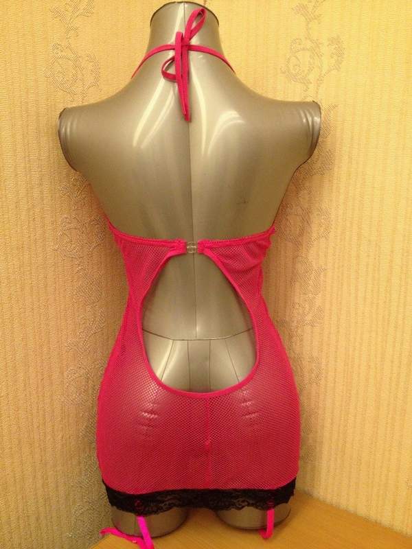 Соблазнительная сорочка с открытой спинкой из эластичной сетки. Чулки для чулочков в комплекте
