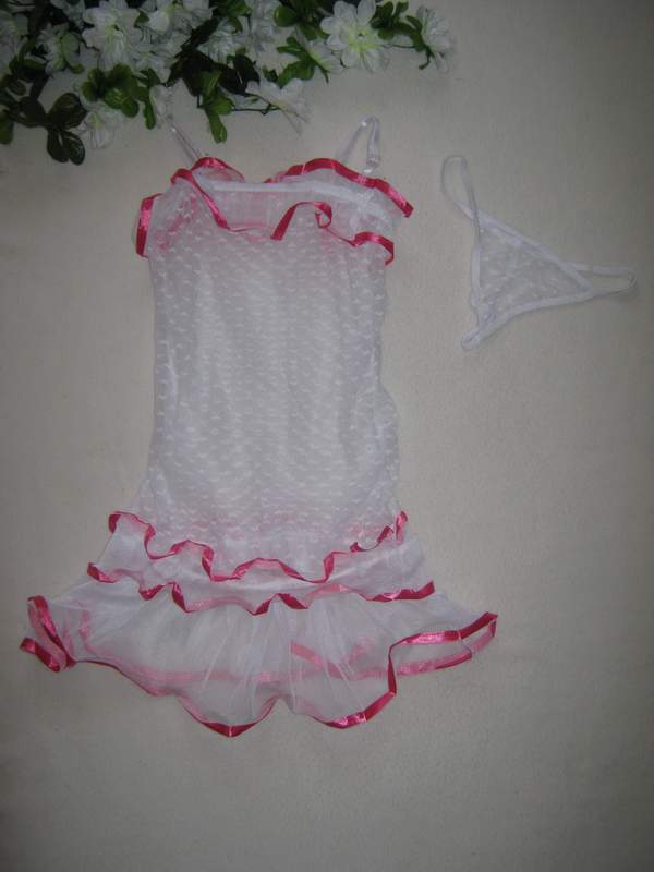 Полупрозрачная сорочка на тонких бретельках украшена рисунком сердечко. Декором служит тонкая ярко-розовая ленточка.