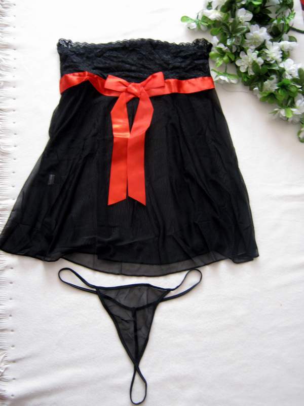 Сексуальная сорочка без бретелек, декорированная красной атласной лентой под грудью. Лиф выполнен из мягкого кружева, подол из нежного тюля.