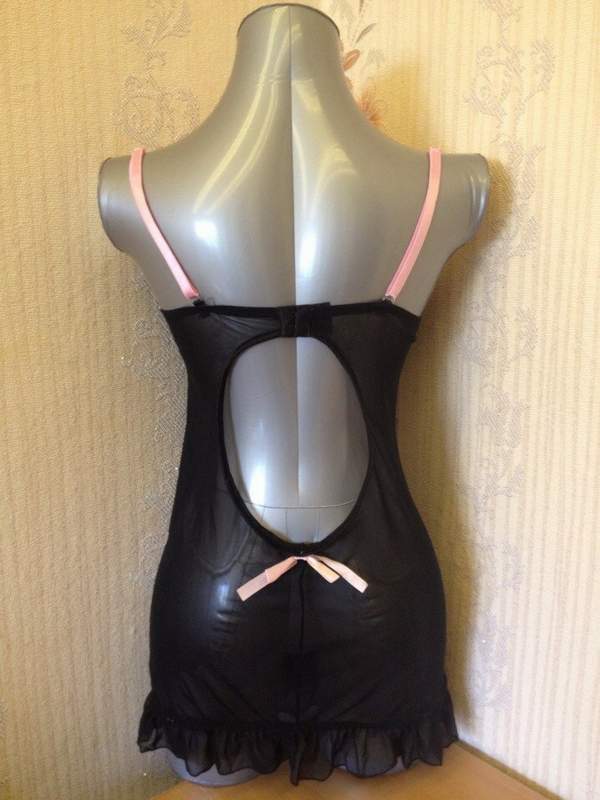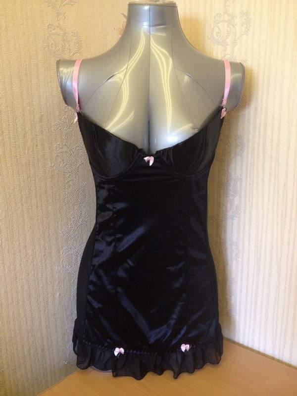 Обтягивающая сорочка с чашечками на косточках. По низу сорочка украшена оборками из сеточки и бантиками и сзади имеет небольшой круглый вырез. В комплекте съемные подвязки для чулок и трусики.