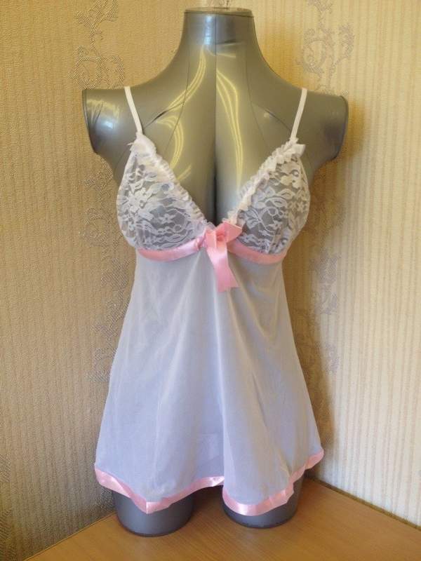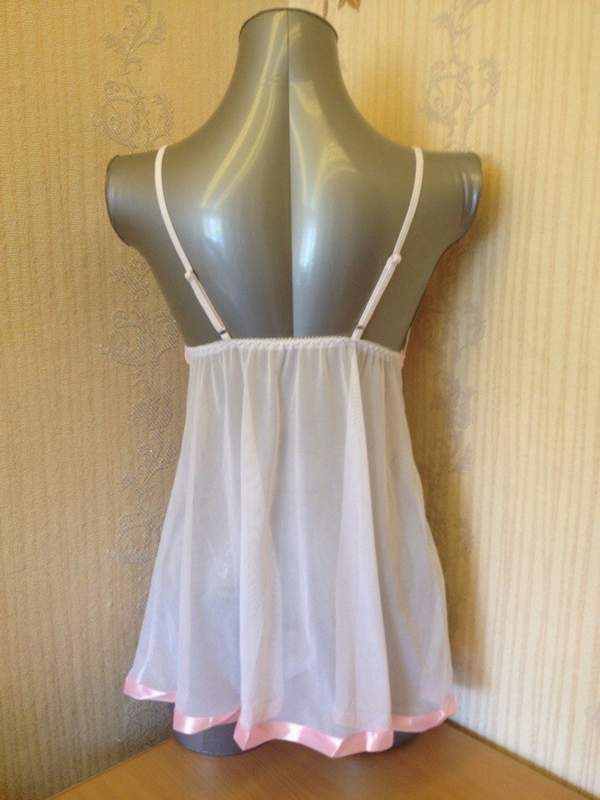 Романтичная сорочка выполнена из легкой сетчатой ткани. Кружевной лиф визуально увеличивает грудь. По краю и под грудью украшена нежно-розовой атласной лентой.
