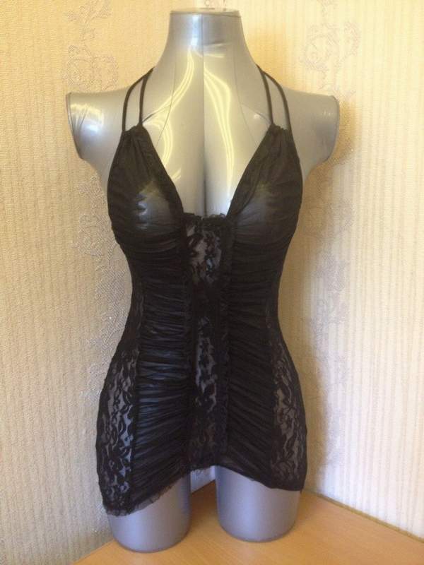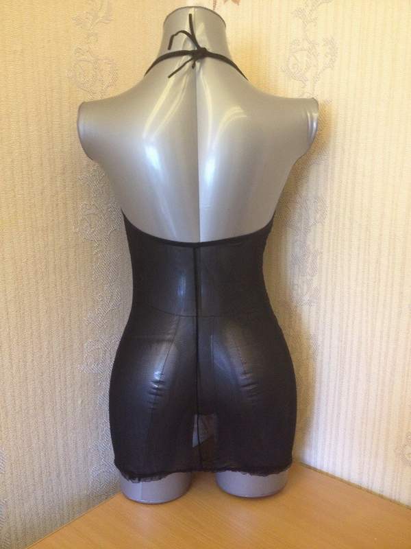 Сорочка с кружевными вставками и гофрированной отделкой. Завязчки на шее позволяют оставаться спинке открытой. Трусики и подвязки в комплекте.