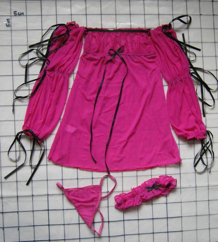 Ярко-малиновая сорочка, открывающая плечи. В комплекте сорочка, подвязка, трусики-стринги