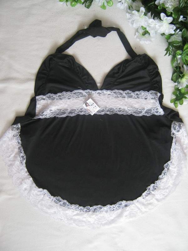 Черная короткая сорочка завязывается на шее и спинке, украшением является тонкое контрастное кружево.