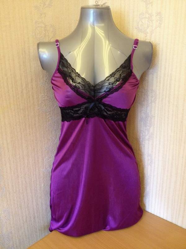 Длинная сорочка из атласного материала. Лиф обрамлен черным кружевом.