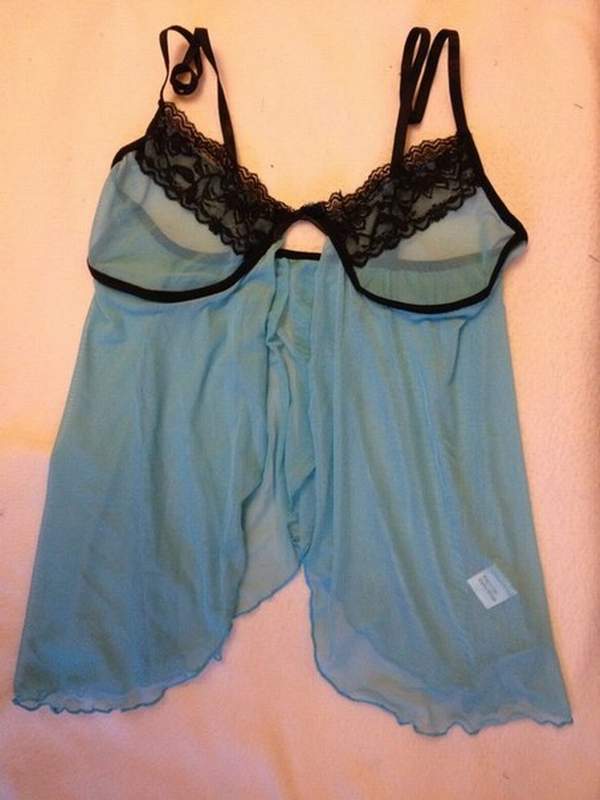 Легкая полупрозрачная сорочка бледно-голубого цвета с контрастным черным кружевом.